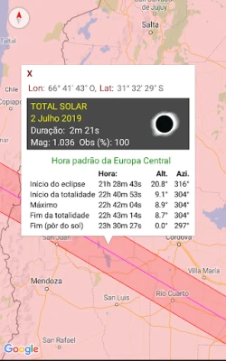 Desvende os mistérios celestes e prepare-se para os espetáculos cósmicos mais grandiosos, tanto no presente quanto no passado e futuro. Esta aplicação é a sua janela pessoal para o universo dos eclipses solares e lunares, bem como dos trânsitos planetários, diretamente na palma da sua mão. Esqueça as incertezas: descubra exatamente onde e quando os próximos eventos serão visíveis, como se apresentarão e qual a sua duração, desde a sua localização até os pontos mais remotos do globo. É a ferramenta definitiva para entusiastas da astronomia e observadores curiosos.