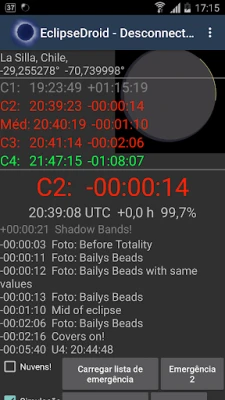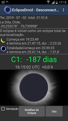 Prepare-se com confiança selecionando seu local de observação no mapa, em uma lista predefinida ou inserindo coordenadas. O modo de simulação de eclipse do **EclipseDroid** permite que você ensaie seu programa de observação, garantindo que cada detalhe esteja perfeito. Explore layouts de tela variados: desde uma visão condensada com circunstâncias locais e uma animação do eclipse, até o layout clássico com contagens regressivas para todos os contatos, uma lista de eventos futuros e uma visualização em tempo real do eclipse. A tela de "detalhes do eclipse" oferece informações globais e locais abrangentes, tabelas de magnitude para fotógrafos e a opção de adicionar o evento ao seu calendário pessoal, expandindo seu alcance com um banco de dados de elementos que abrange milênios e acesso a mapas da NASA para uma compreensão completa do universo.