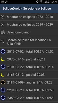 EclipseDroid é o companheiro essencial para observadores de eclipses solares. Descubra dados precisos de qualquer eclipse, total, anular, híbrido ou parcial, em qualquer local e período. Desfrute plenamente do espetáculo: EclipseDroid cuida dos detalhes, você observa o Sol Negro.