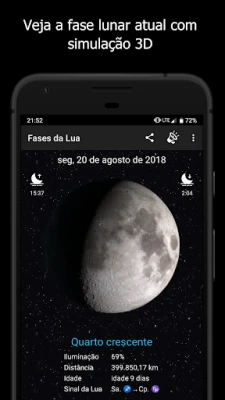 Descubra o universo lunar com Phases of the Moon! Explore cada fase da Lua em 3D, com um calendário completo, atlas detalhado e papel de parede ao vivo. Obtenha previsões de caça/pesca, insights de astrologia e acompanhe Luas Cheias, Novas e eclipses. Sua visão completa da Lua.