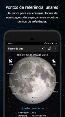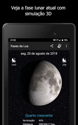 Além de fornecer informações atualizadas sobre todas as oito fases lunares – desde a Lua Nova e Crescente até a Cheia e Minguante – este aplicativo transforma o seu dispositivo em um verdadeiro observatório pessoal. Explore a superfície lunar com um atlas interativo detalhado, onde você pode dar zoom para identificar crateras famosas, mares e até mesmo locais históricos de pouso de naves espaciais. A navegação é fluida: arraste a Lua para frente ou para trás no tempo, ou gire-a para avançar rapidamente, revelando a data, a distância e a porcentagem de iluminação em tempo real, sempre ajustado à sua localização geográfica através de detecção GPS. Compartilhe suas descobertas lunares e as belas imagens com amigos em suas redes sociais preferidas, ou consulte o calendário de eventos para se manter a par dos espetáculos celestes mais marcantes do mês.