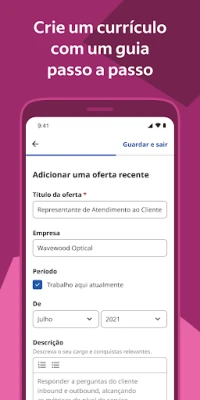 Mergulhe em um vasto banco de dados que compila não apenas as vagas publicadas diretamente no Indeed, mas também de inúmeros outros portais de carreira, apresentando-lhe recomendações personalizadas com base em suas preferências e trajetória profissional. Crie ou carregue seu currículo diretamente na plataforma Indeed, permitindo que as empresas descubram seu talento e experiência. Candidate-se com um único toque, utilizando seu perfil salvo para otimizar o tempo e evitar a repetição de dados em cada formulário. Mantenha-se informado sobre o status de suas candidaturas, com notificações claras que indicam quando uma empresa visualiza ou responde ao seu interesse.