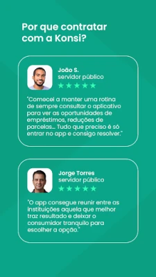 Descubra o app Konsi: a forma gratuita, segura e rápida de comparar e contratar seu empréstimo consignado online. Acesse ofertas de 22 bancos, melhore contratos existentes e encontre condições exclusivas, mesmo negativado. Condições ideais para servidores, aposentados e trabalhadores, com a confiança de um serviço regulamentado.