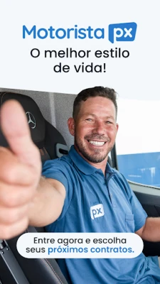 Motorista PX - Você só dirige! Conecta motoristas de caminhão a transportadoras, proporcionando liberdade total. Escolha suas rotas, cargas, horários e caminhão. Ganhe melhor remuneração, trabalhe sem vínculo e até sem caminhão próprio. Sua agenda, suas regras!
