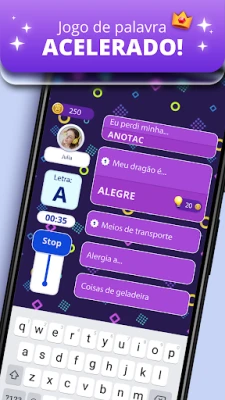 Desperte o mestre das palavras que há em você com STOP 2, a releitura definitiva do aclamado jogo de categorias que você conhece e ama! Esqueça o papel e a caneta; agora, a emoção da adedonha, adedanha ou Basta ganha vida em um formato digital eletrizante. Prepare-se para um desafio de raciocínio rápido onde cada letra abre um universo de possibilidades. Com apenas uma letra para guiar suas respostas e um cronômetro implacável, você precisará provar seu conhecimento em diversas categorias, superando adversários e colecionando vitórias a cada rodada neste quiz de conhecimentos gerais.